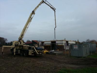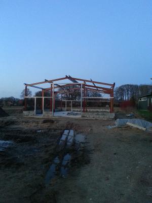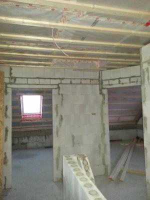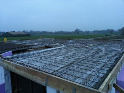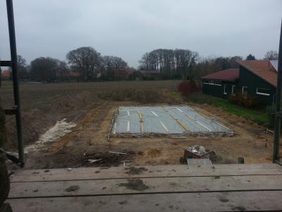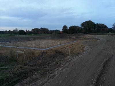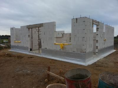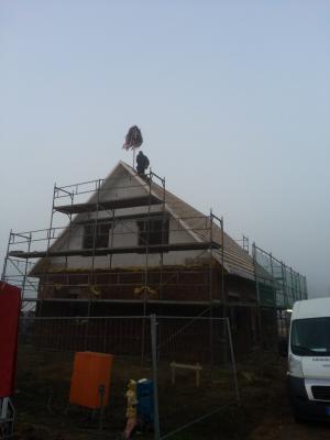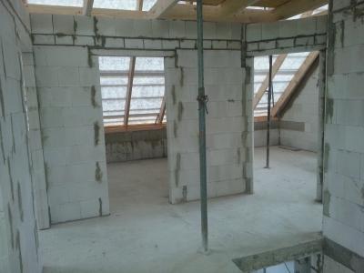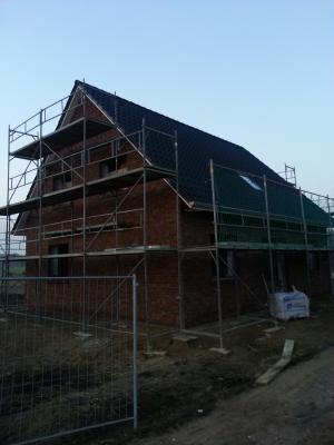 Haus ist verklinkert, im OG stehen die Wände und die Platte für die Halle ist fertig